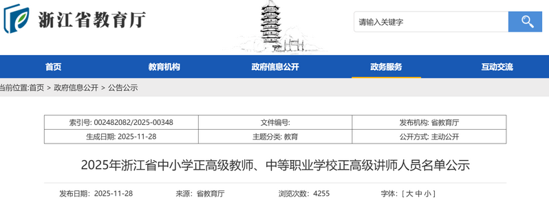 近日,浙江省教育廳網站發布《2025年浙江省中小學正高級教師、中等職業學校正高級講師人員名單公示》。經個人申報、學校和市地推薦、專家評審,我市2名教師通過中小學正高級教師評審。