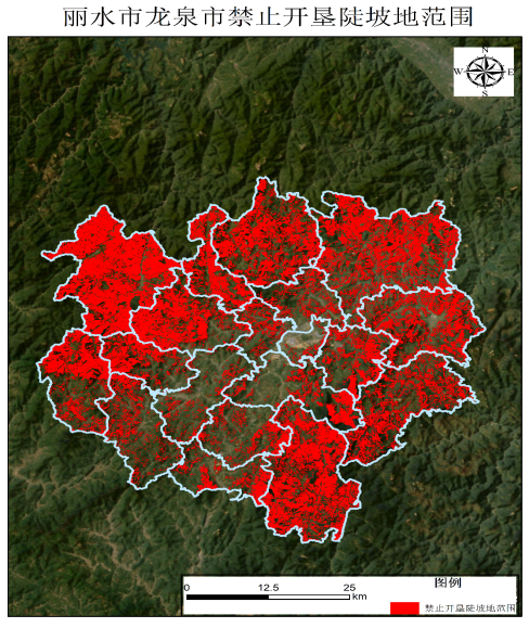 劃定結(jié)果顯示,龍泉市禁止開墾陡坡地面積共計132879.96hm2,共計1486個圖斑,占國土面積43.64%,其中二十五度以上涉及圖斑1486個,涉及面積132874.87hm2,二十五度以下涉及圖斑11個,涉及面積5.09hm2。其中,住龍鎮(zhèn)的禁止開墾陡坡地面積最大,劍池街道的禁止開墾陡坡地面積最小。